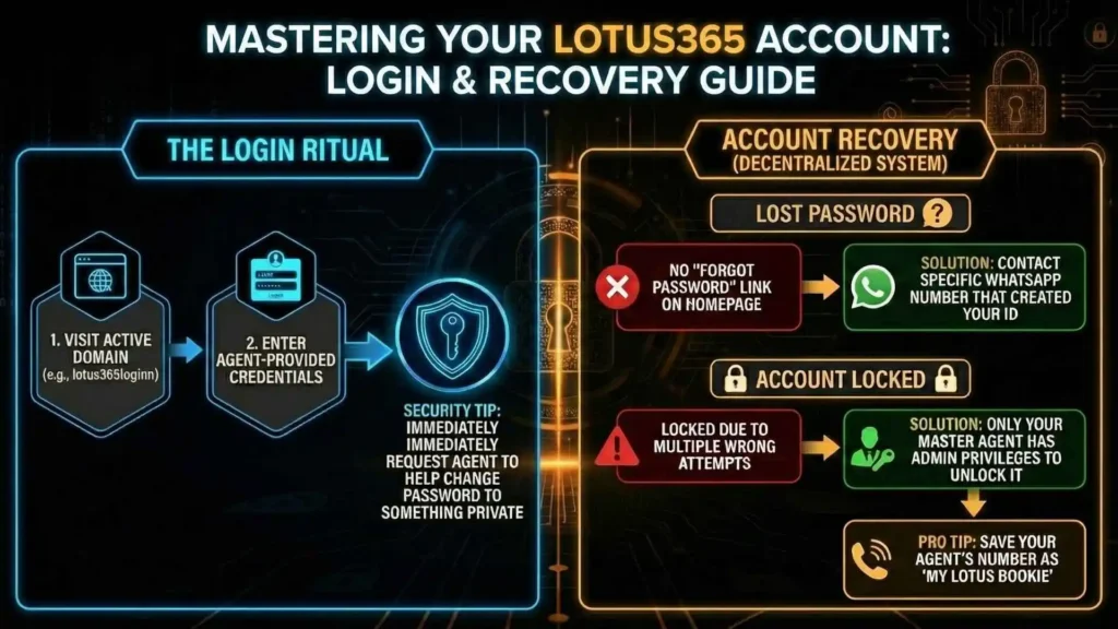 Account Locked: If your account is locked due to multiple wrong attempts, only your Master Agent has the admin privileges to unlock it. Always save your agent’s number as “My Lotus Bookie” to find it easily.