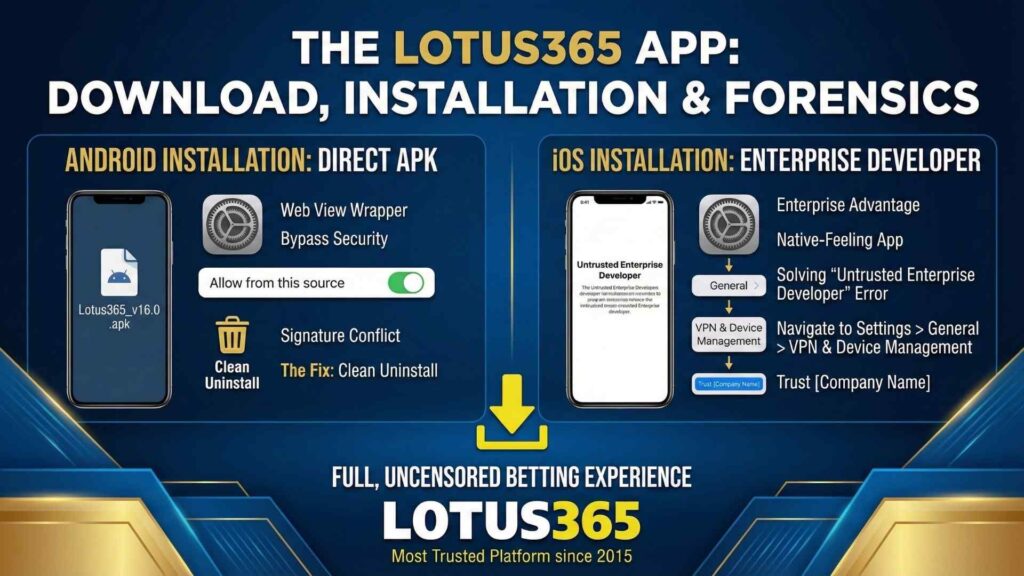 The search query Lotus 365 App download is the highest-volume entry point for the brand. Because the app provides features that go beyond standard store policies, it is distributed via Direct APK (Android) and Enterprise Certificate (iOS). This ensures you get the full, uncensored betting experience.