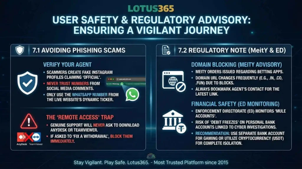 Domain Blocking: In February 2023, MeitY issued orders regarding various betting apps, including Lotus365. This is why the domain URL changes frequently (e.g., from .in to .co to .fun). Always bookmark your agent’s contact to get the latest link.